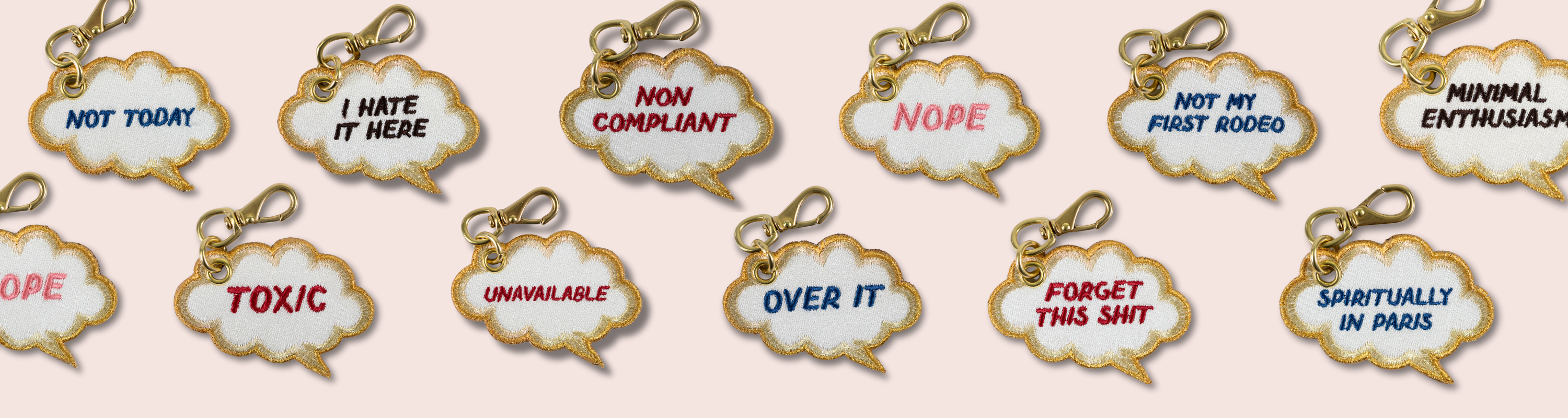 A little wit goes a long way. Thought Bubbles feature meticulous embroidery, metallic thread details, engraved leather backs, and polished brass—perfect for layering with personality.