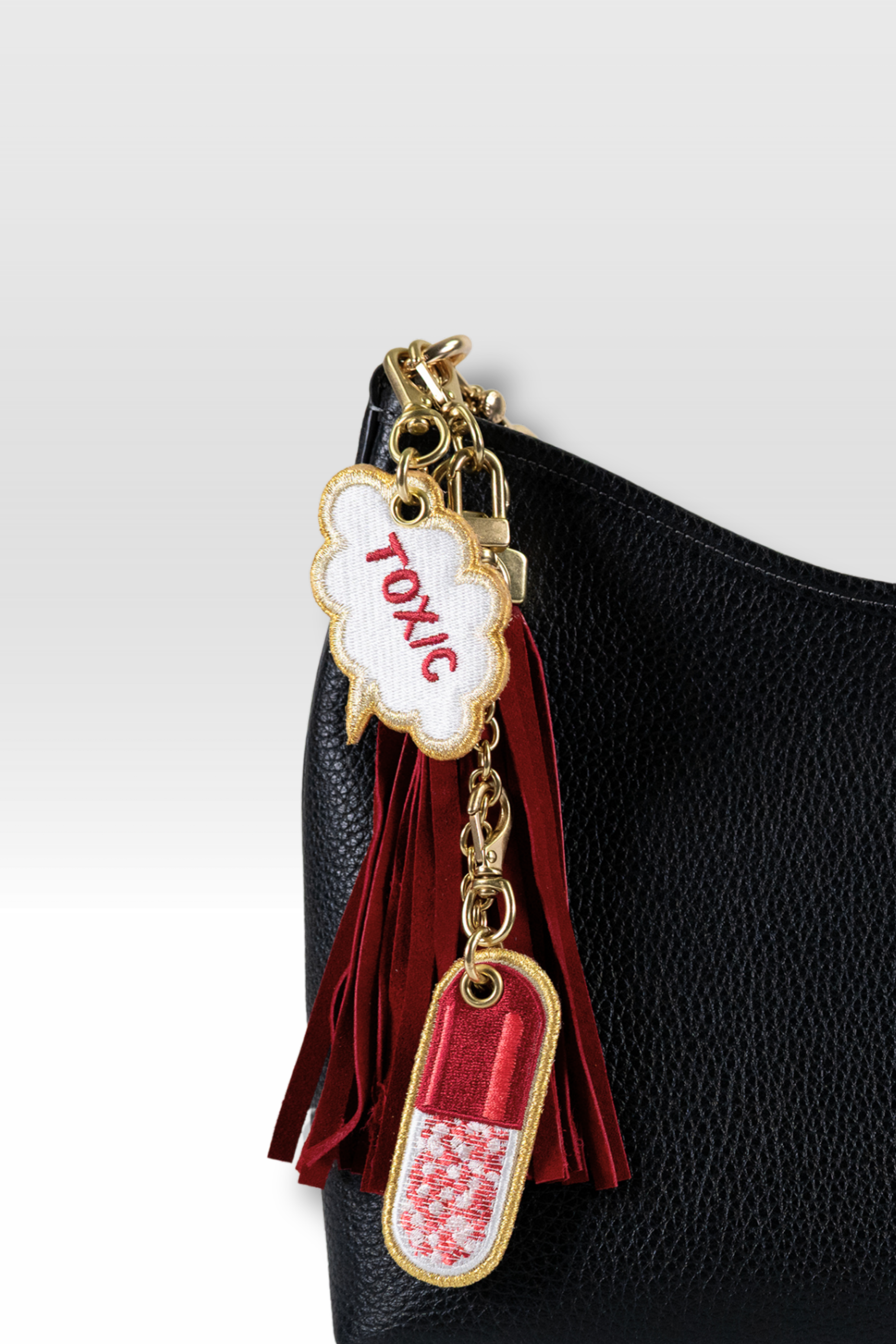 Thought Bubbles bring a dose of wit and irreverence to the collection—cheeky, charming, and impossible to resist. Each one is handcrafted using the same meticulous techniques as our Deluxe Embroidery designs, stitched with precision and finished with gleaming brass hardware. Their expressive phrases capture the perfect mood, while their compact scale makes them ideal for layering within a curated bag-charm stack. Outlined in shimmering metallic thread, Thought Bubbles add a playful spark to even the most refined edit.